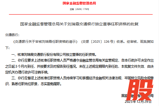 1月4日金融一线消息,国家金融监督管理总局关于刘瑞霞交通银行独立董事任职资格的批复,核准刘瑞霞交通银行股份有限公司独立董事的任职资格。