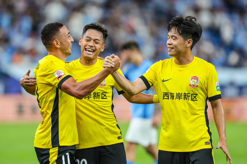 9月28日,青岛西海岸队球员戴维森(左一)在比赛中与队友庆祝进球。\n 当日,在广东深圳举行的2025赛季中国足球超级联赛第26轮比赛中,青岛西海岸队客场2比1战胜深圳新鹏城队。\n 新华社发(彭志刚摄)