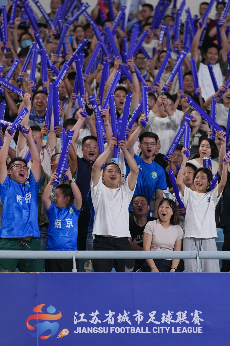 10月4日,球迷在现场为球员加油助威。\n 当日,在江苏南京举行的2025江苏省城市足球联赛(“苏超”)四分之一决赛中,南京队主场与连云港队在常规时间1比1战平,通过点球大战,南京队以5比3的总比分战胜连云港队,晋级半决赛。\n 新华社记者 李博 摄